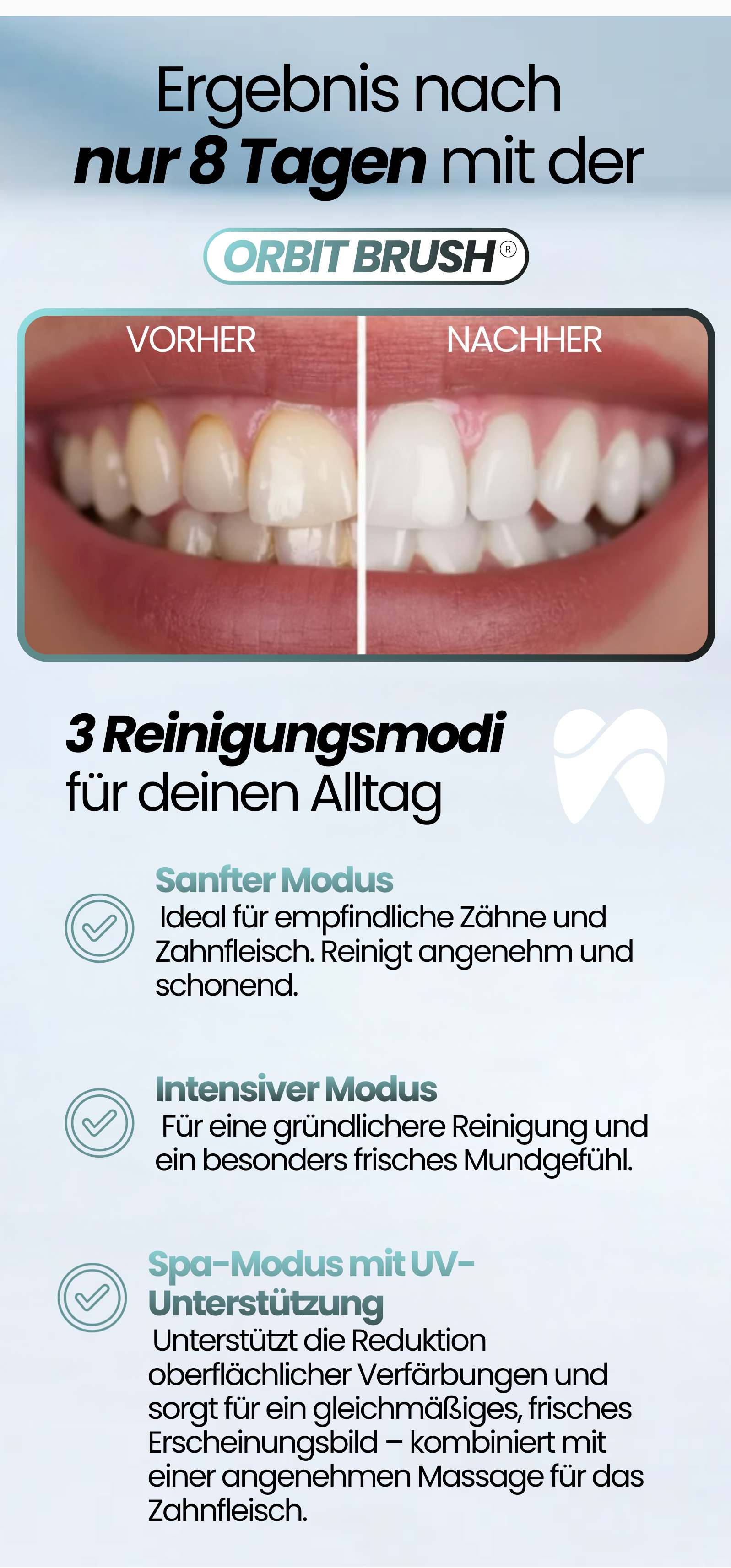 ORBIT BRUSH™ reinigt den gesamten Mund gleichmäßig, erreicht auch schwer zugängliche Bereiche und unterstützt ein sichtbar frischeres Zahngefühl – sanft und ohne unnötigen Aufwand.