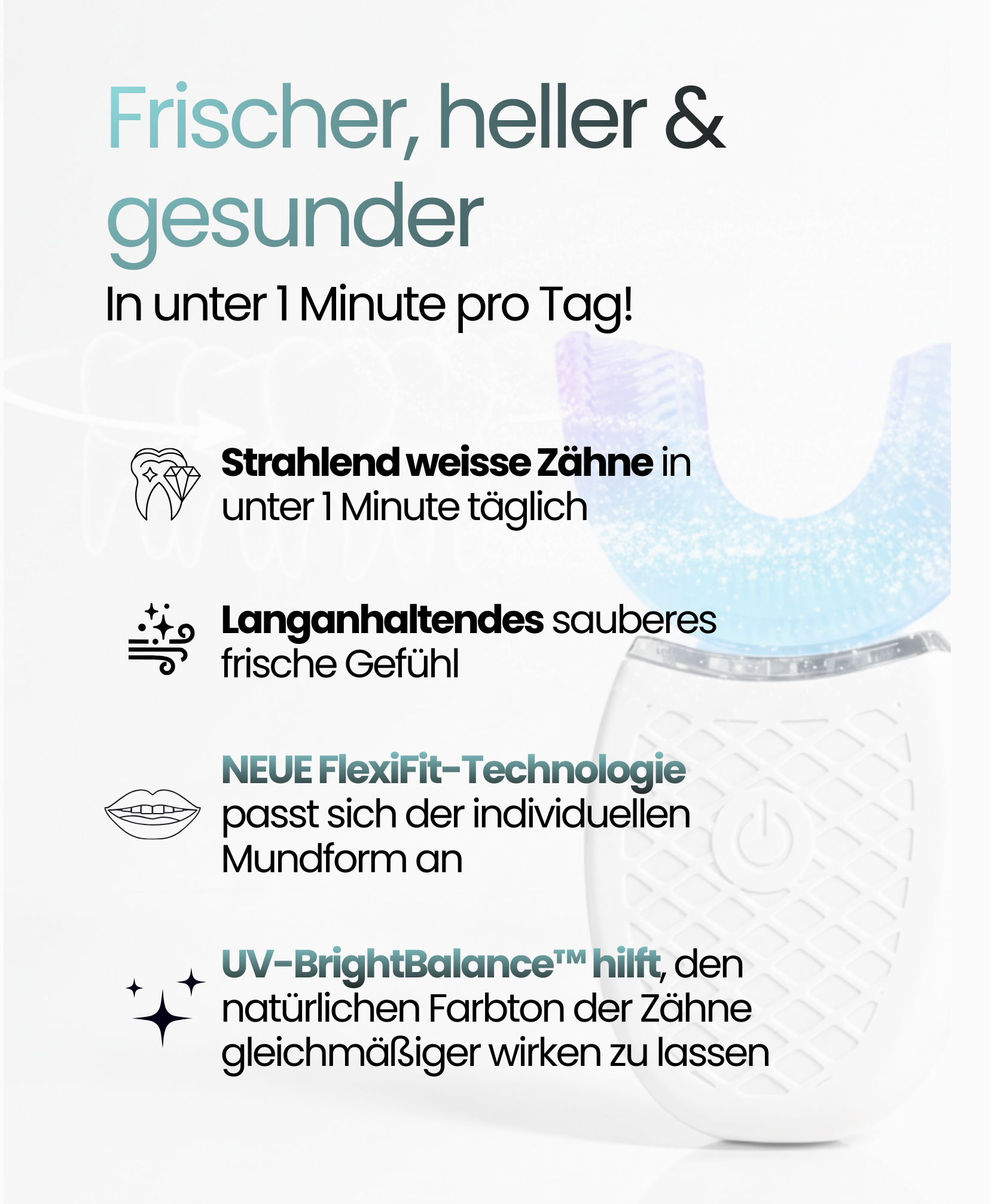 Zusätzlich unterstützt die UV-BrightBalance™ Technologie die Reduktion oberflächlicher Verfärbungen und sorgt bei regelmäßiger Anwendung für ein frischeres, gleichmäßigeres Zahngefühl.